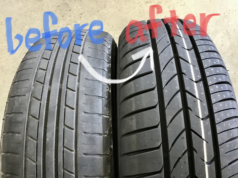 写真3枚目の並んだタイヤ、左がビフォー右がアフターで背の高い車特有の「角減り」にも強く安定した走りを実現してくれるタイヤです。